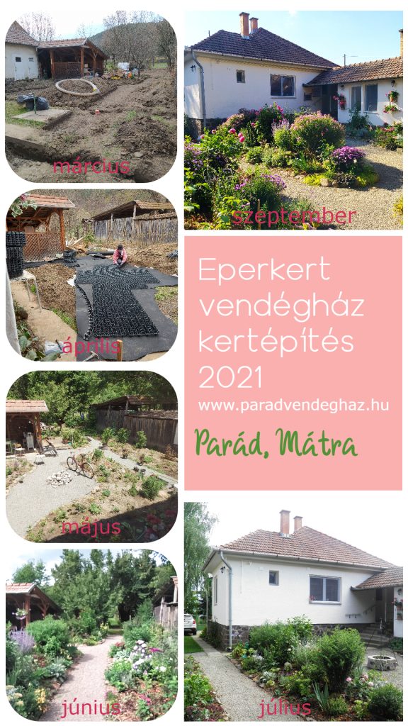 A ház felújításával párhuzamosan készült a teljes belső kertrész, a “díszkert”, de sok növény ültetése, gondozása még Mamám keze munkáját dicséri, főként az előkertben és a gyümölcsösben. Ezeken a részeken is ültettem új cserjéket, virágzó évelőket, szárazságtűrő és sziklakerti növényeket, jellemzően ezek uralják a virágos részeket. Az ültetett növények többsége saját szaporítás, egy időben nagyon belejöttem a kertészeti munkákba, és rengeteg kis sarjat sikerült nevelgetnem, ezekkel töltöttem meg az ágyásokat itt-ott. Ilyenek pl. sziklakertiek, rózsák, nyári orgonák, krizantémek, aranyvesszők, gyógy- és fűszernövények, nefelejcsek… Mindig drukkolok, hogy mi vészeli át a hideg mátrai teleket.