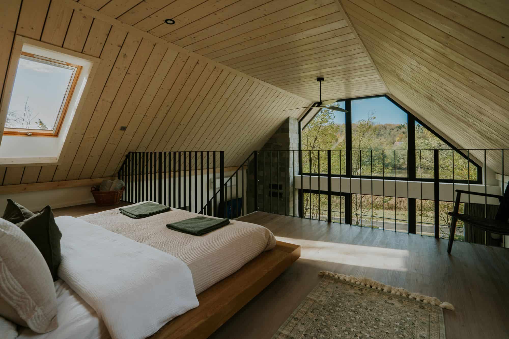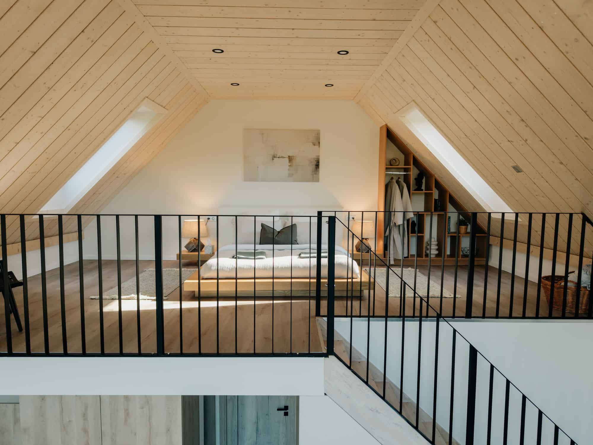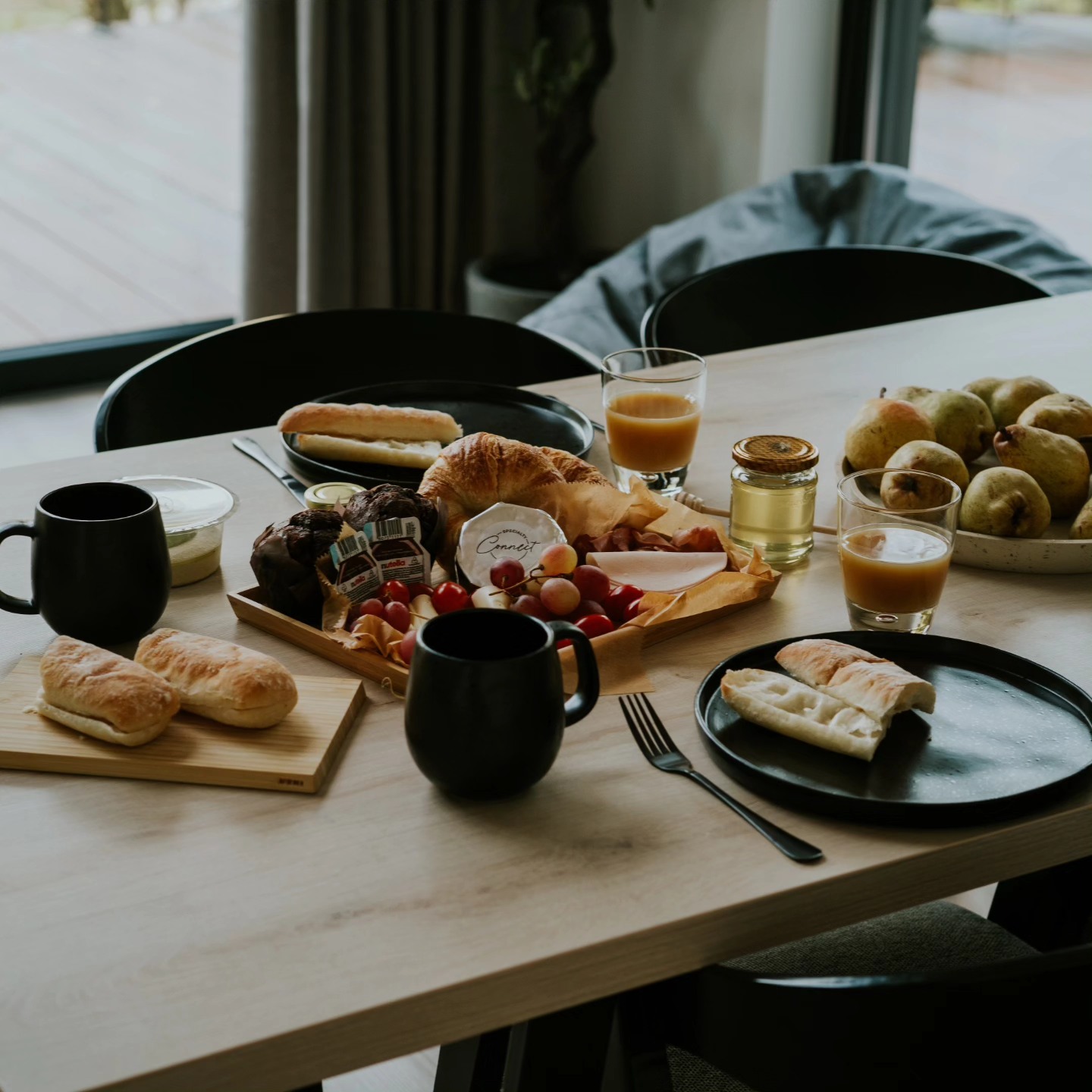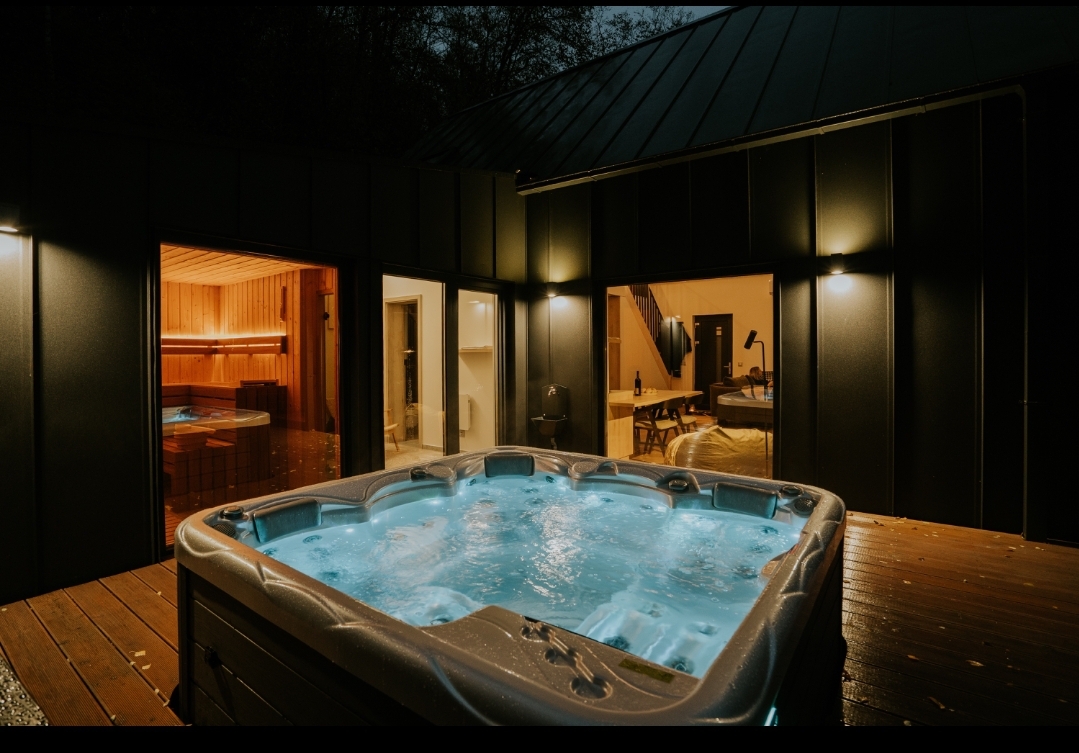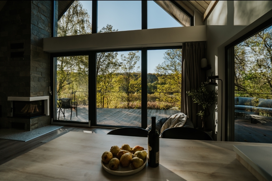 Guests can enjoy unlimited use of the jacuzzi and sauna, while the spacious terrace provides stunning views of a nearby lake. Thanks to the large glass surfaces, nature becomes an integral part of the interior, creating a calm and immersive atmosphere throughout the stay.