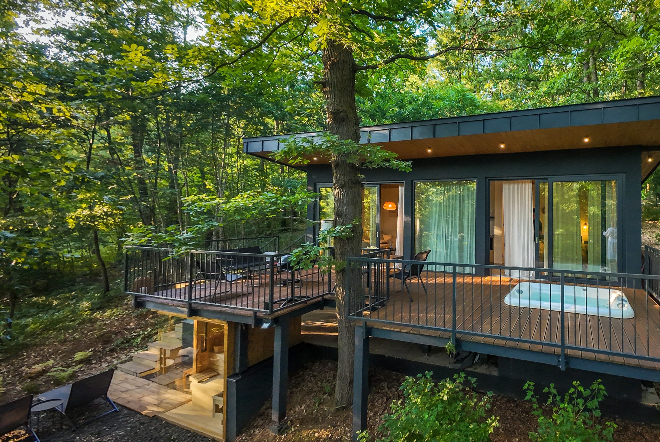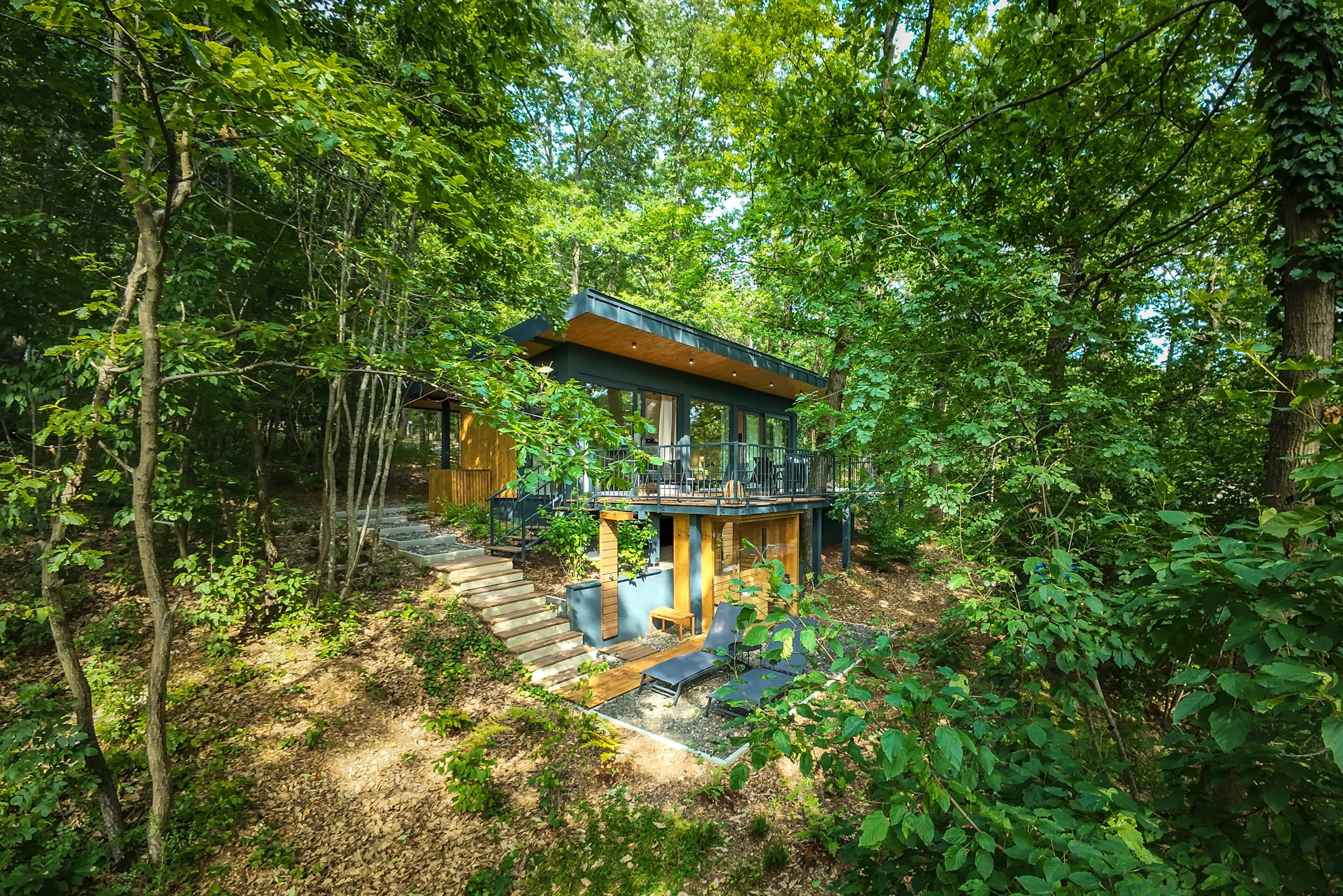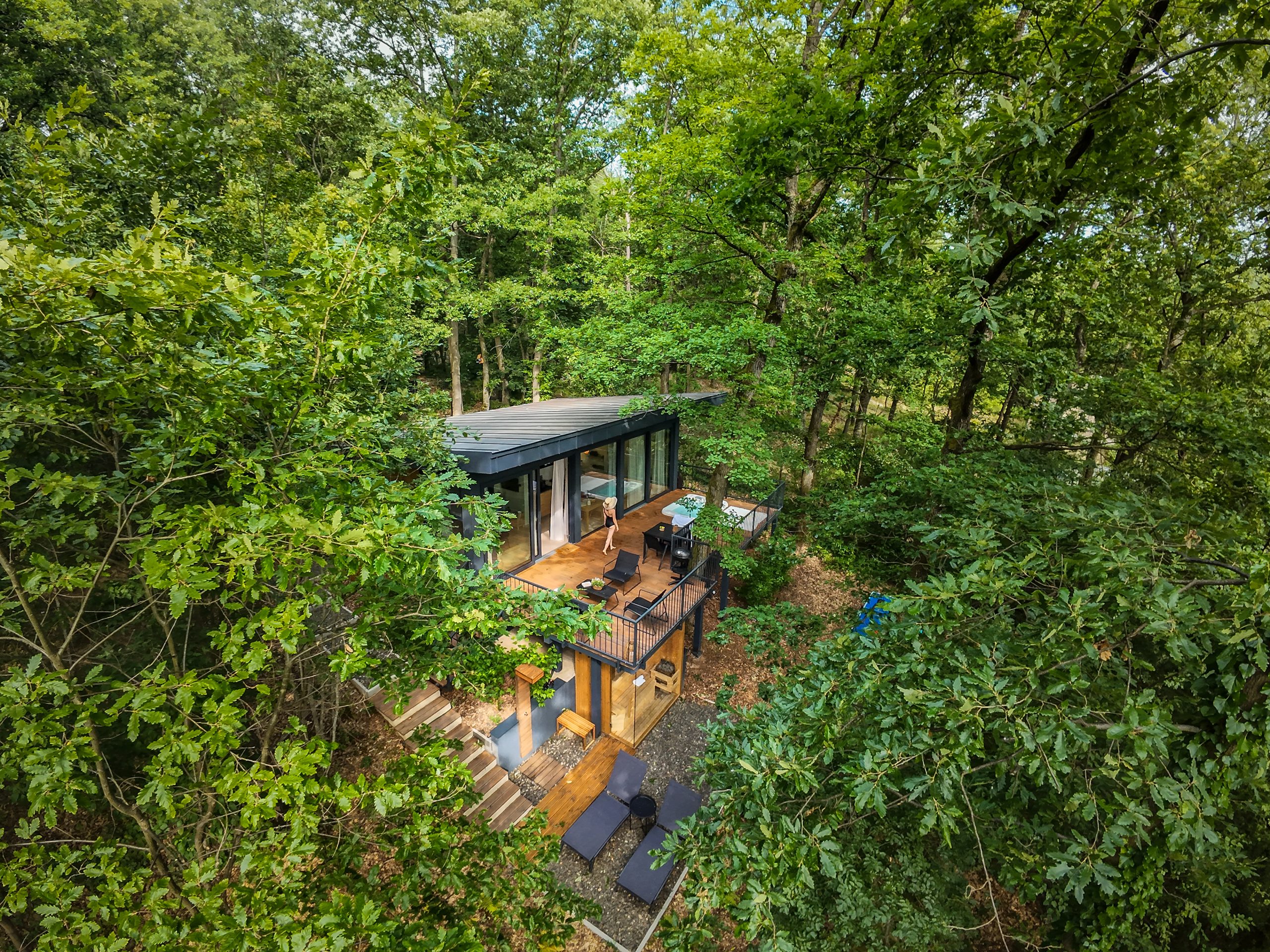 The luxury cabin, nestled among the treetops, offers complete privacy, allowing guests to indulge in spa and wellness experiences.