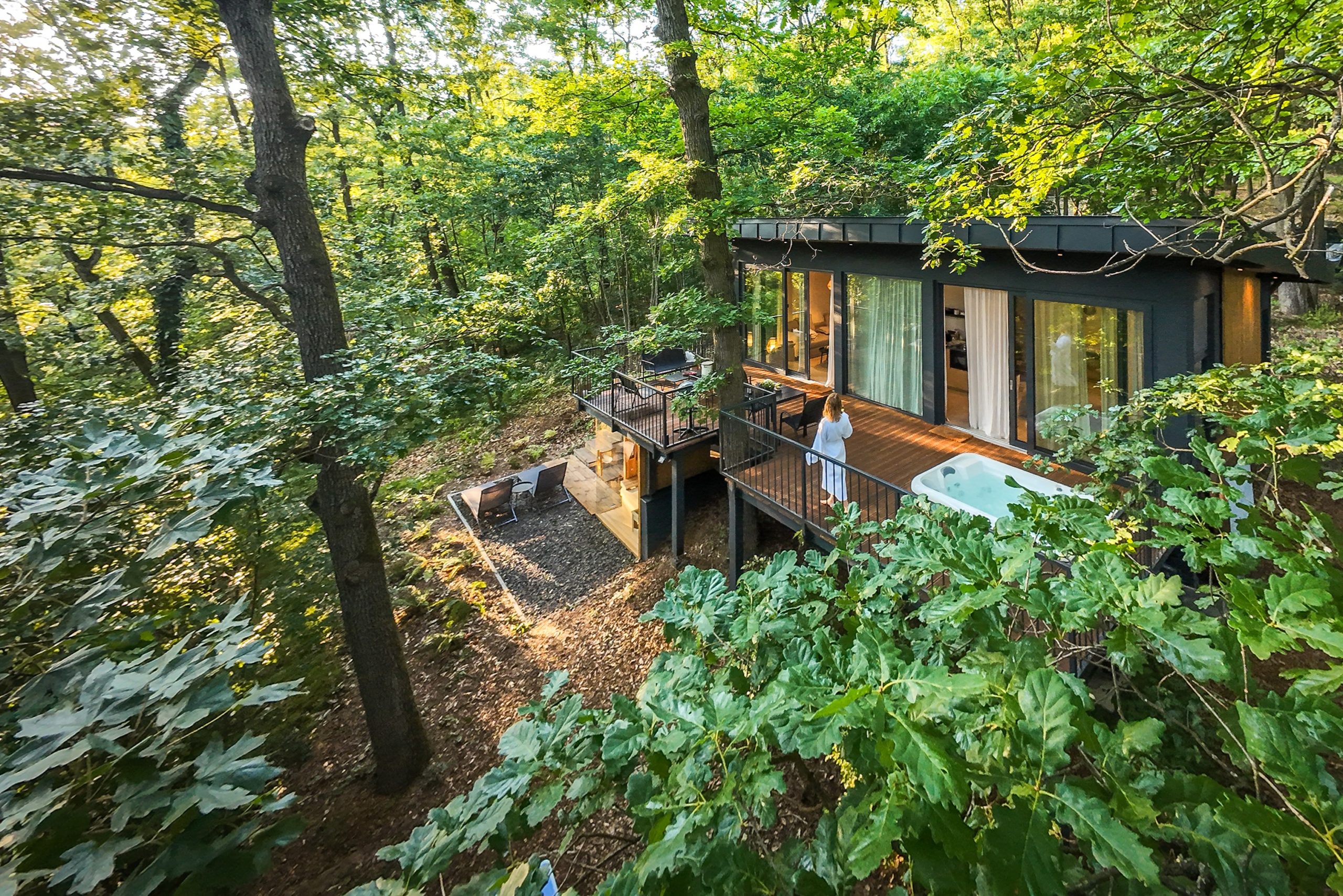 The 36 sqm treetop-level terrace is an ideal spot for morning coffee or evening conversations over a barbecue.