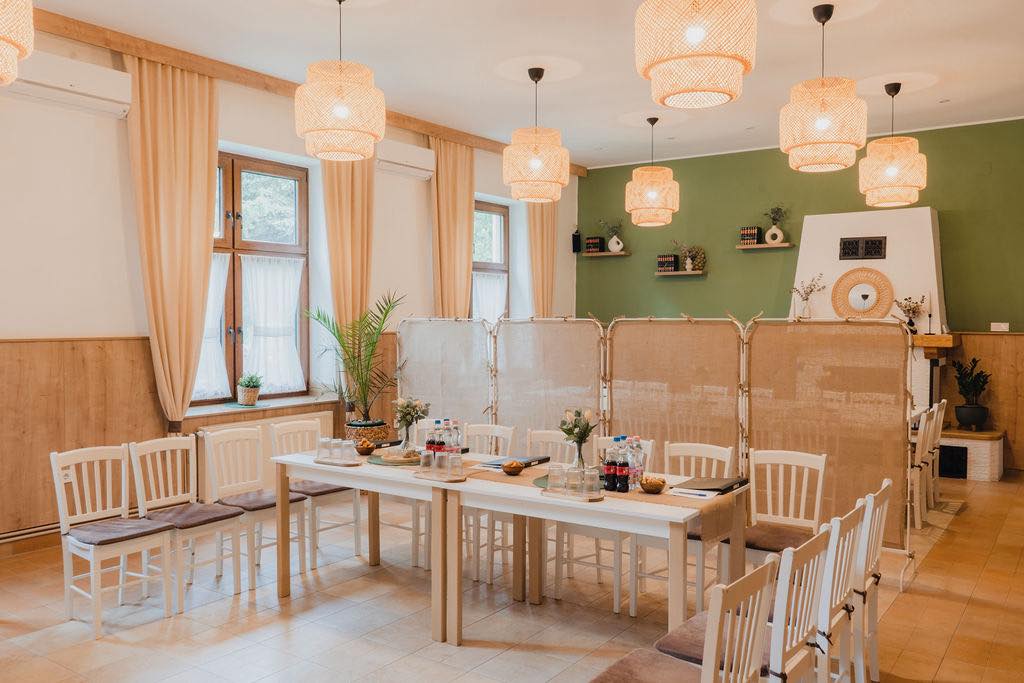 Accommodation is available for up to 32 guests in nine rooms, each with its own private bathroom. For group activities, there is a spacious 40-person event hall and a fully equipped, high-capacity kitchen. Guests can also enjoy full dining service with breakfast, lunch, and dinner upon request.