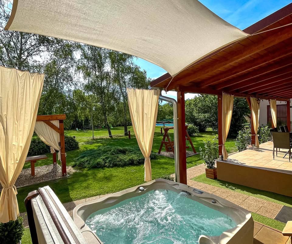Entertainment and relaxation options abound: a charming wine cellar, an exciting games room (billiards, foosball, darts), and a variety of outdoor facilities – including a cooking cauldron and barbecue area, playground with trampoline, climbing frame, football goals, teqball table, and ping-pong. Summer refreshment is ensured by the swimming pool with kids’ section, while full relaxation awaits in the sauna, jacuzzi, and heated igloo.