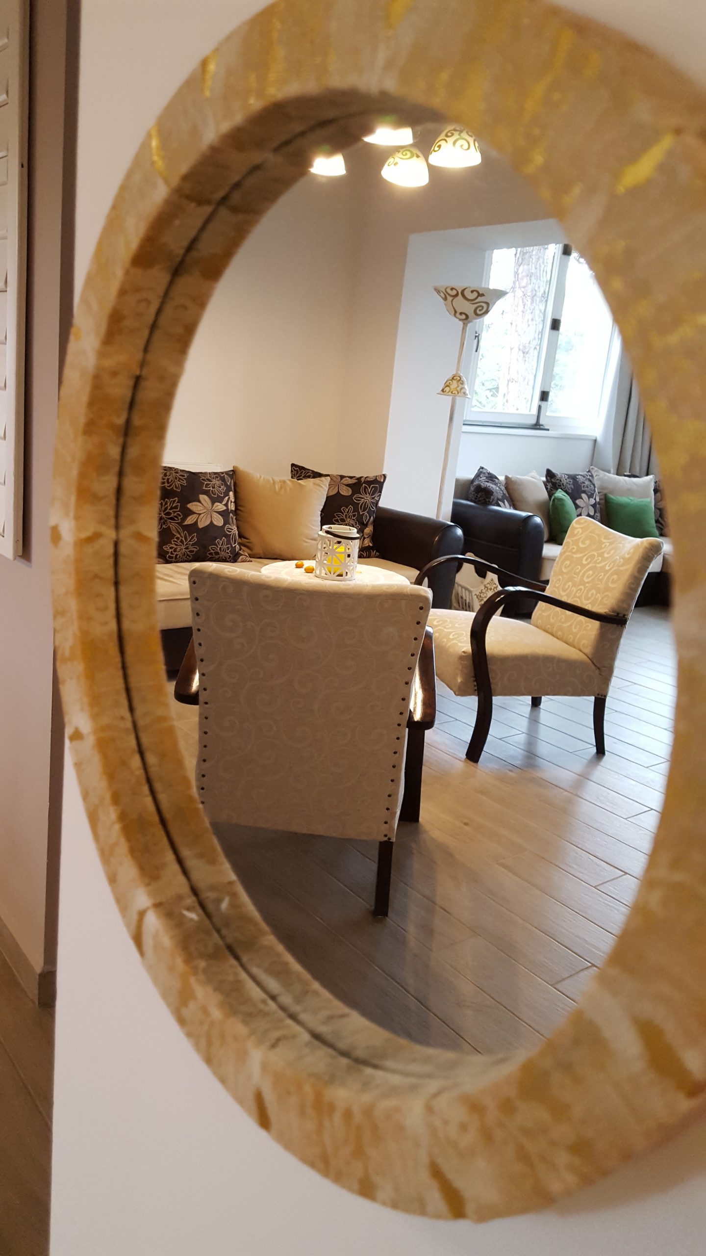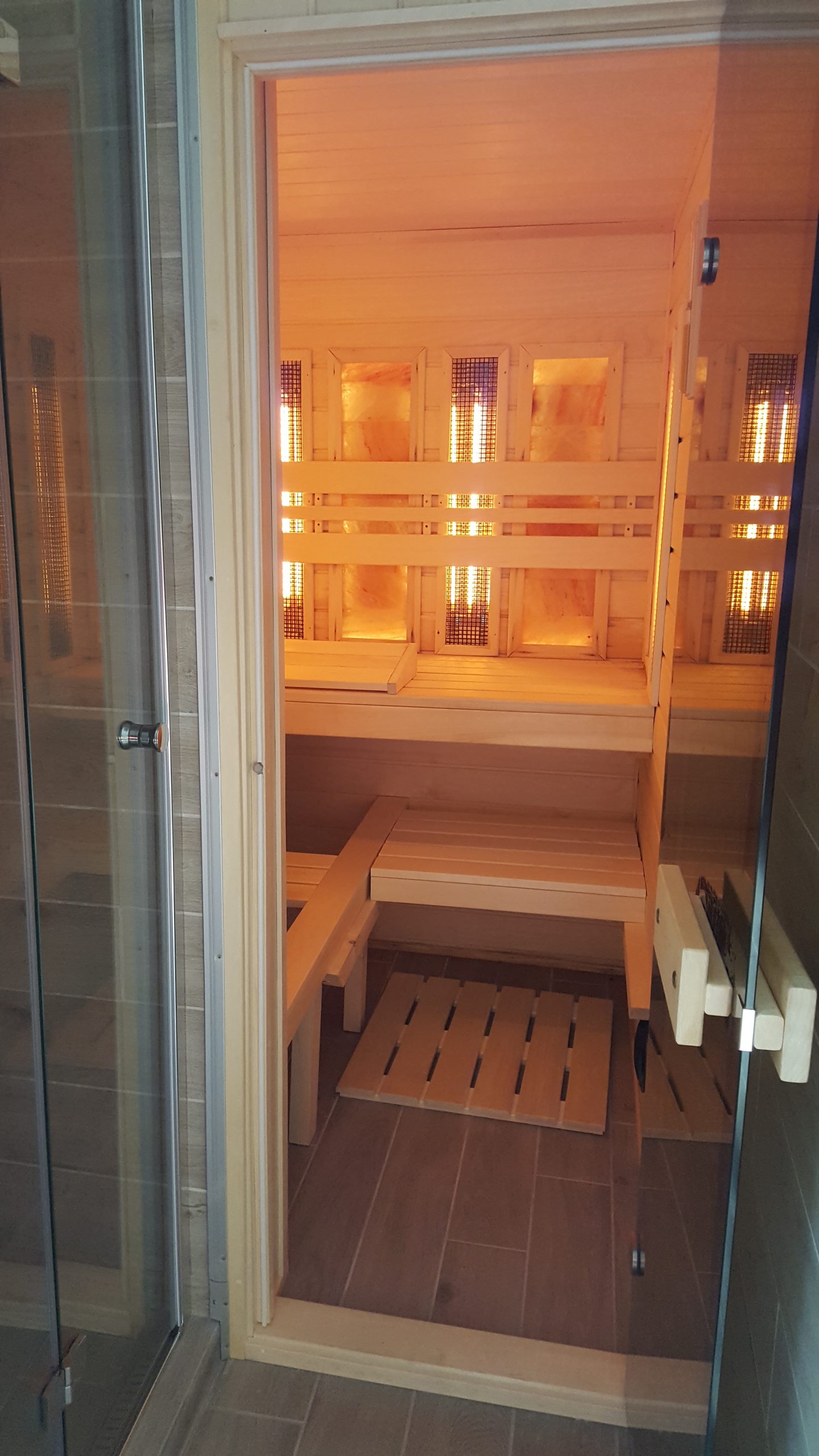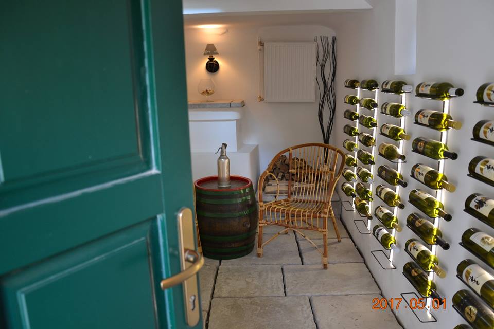 A ház kényelmi szolgáltatásai: kombinált szauna saját zuhannyal, kandalló és a ház csodája a látvány borozgató szalon, melyre egy üveg lapon keresztül lehet lelátni a nappaliból.