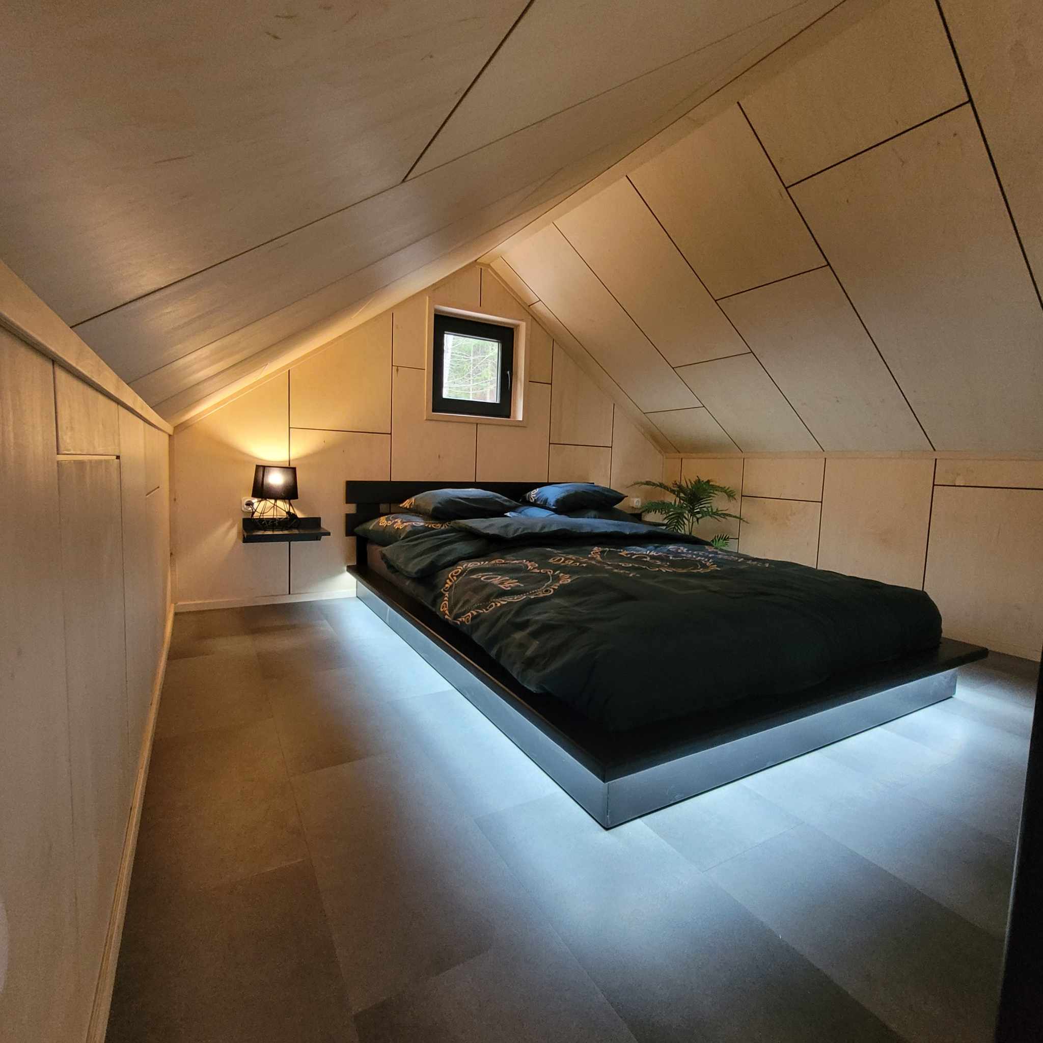 Az emeleten franciaágy, földszinten kinyitható kanapé, konyhasarok, étkezőpult bárszékekkel, fürdőszoba, előszoba, tágas terasz saját pezsgőfürdővel és szaunával.
