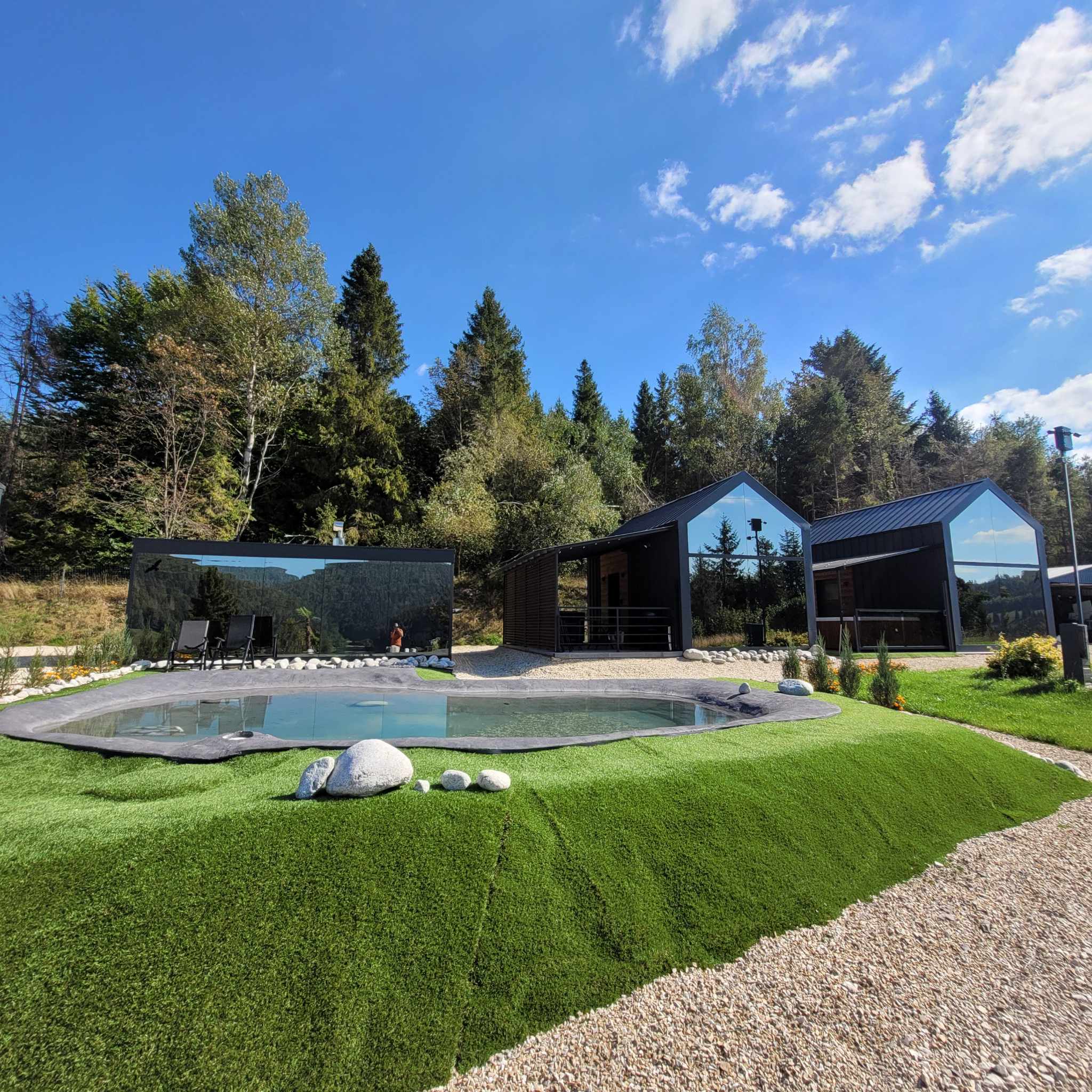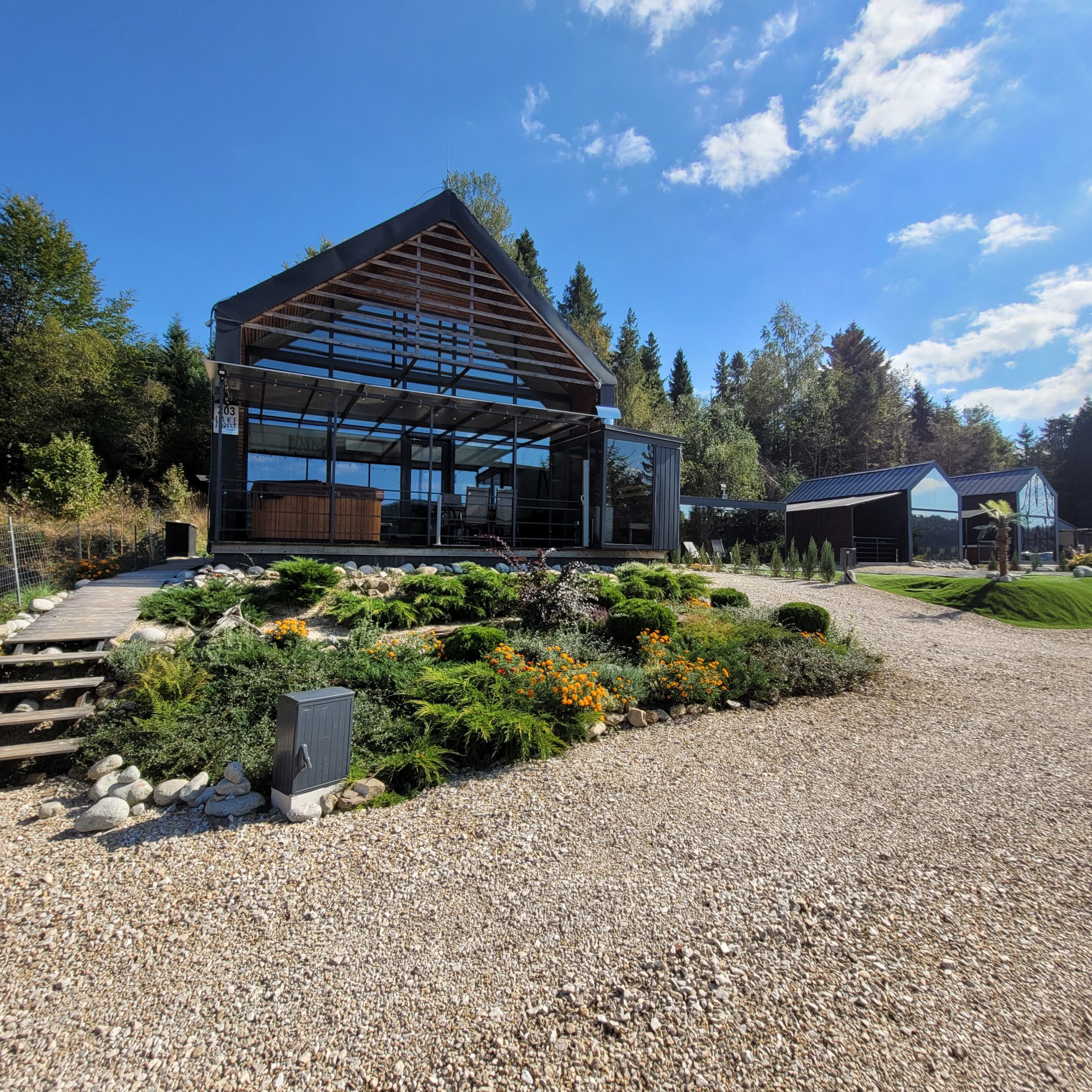 A legnagyobb ház 8+2 fő, a két kisebb Tiny house 2+2 fő részére ideális, mindhárom saját jakuzzival és szanuával rendelkezik, melyet a vendégek korlátlanul használhatnak. A házak eleje teli üveg, ahonnan csodás a kilátás a tóra és a völgyre.