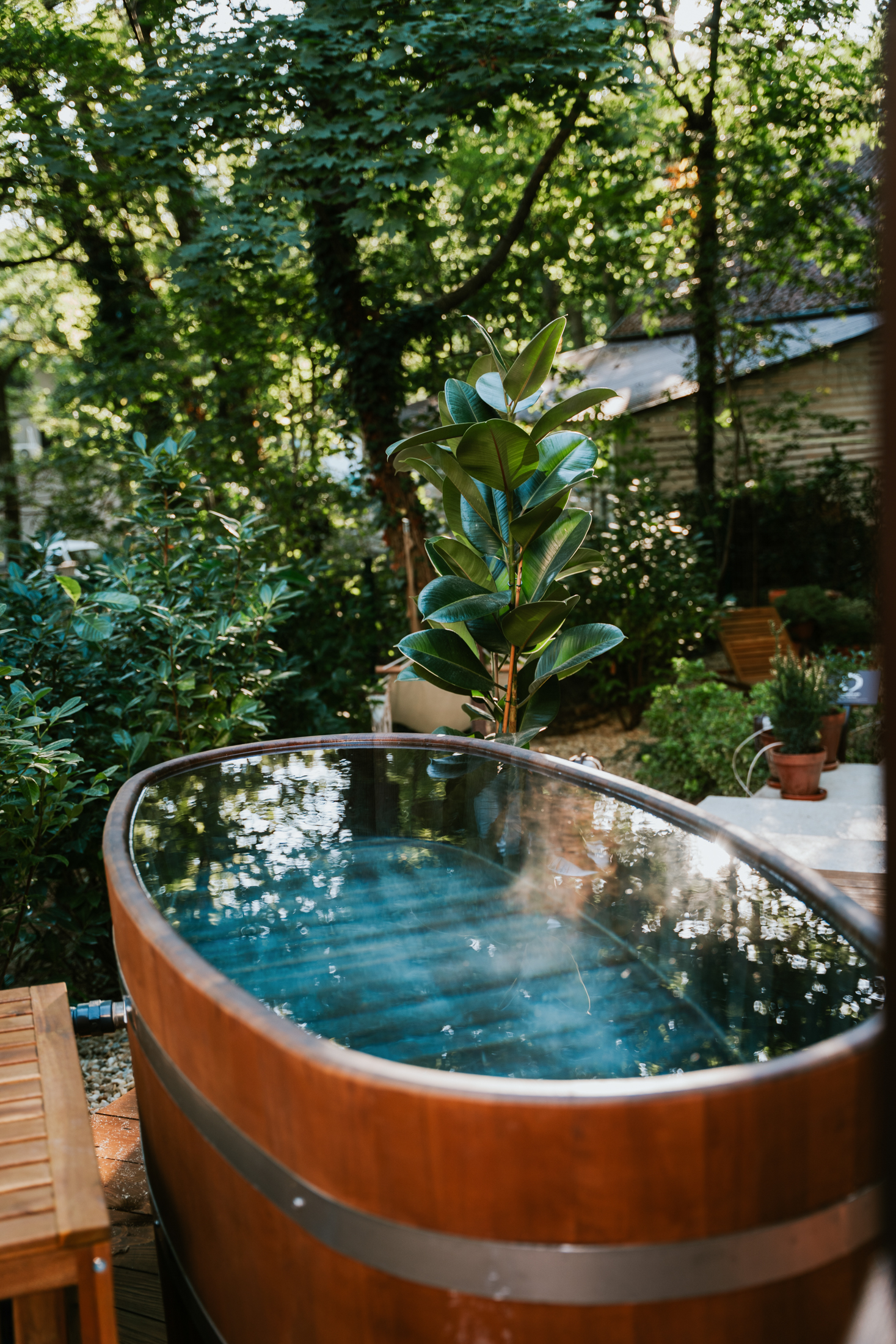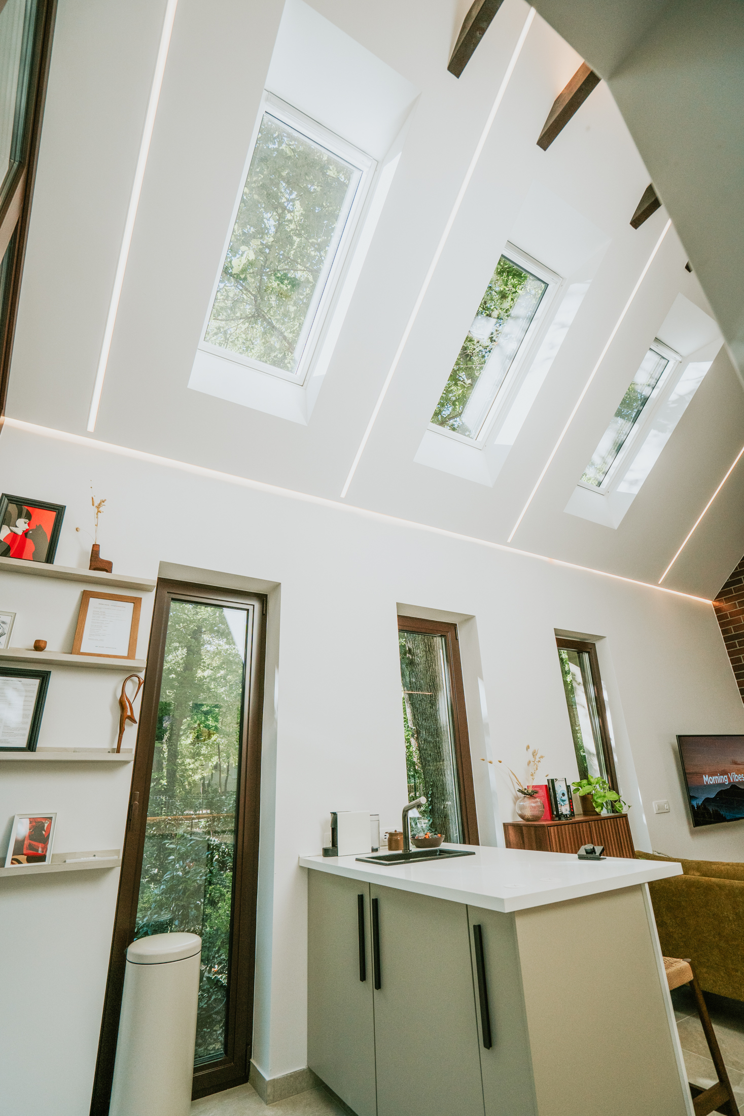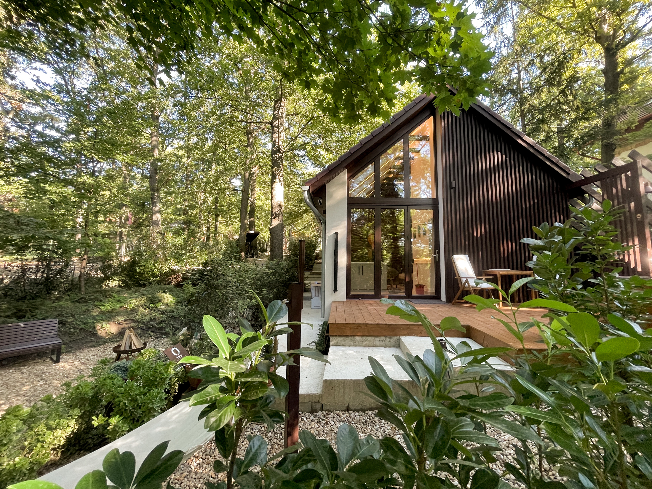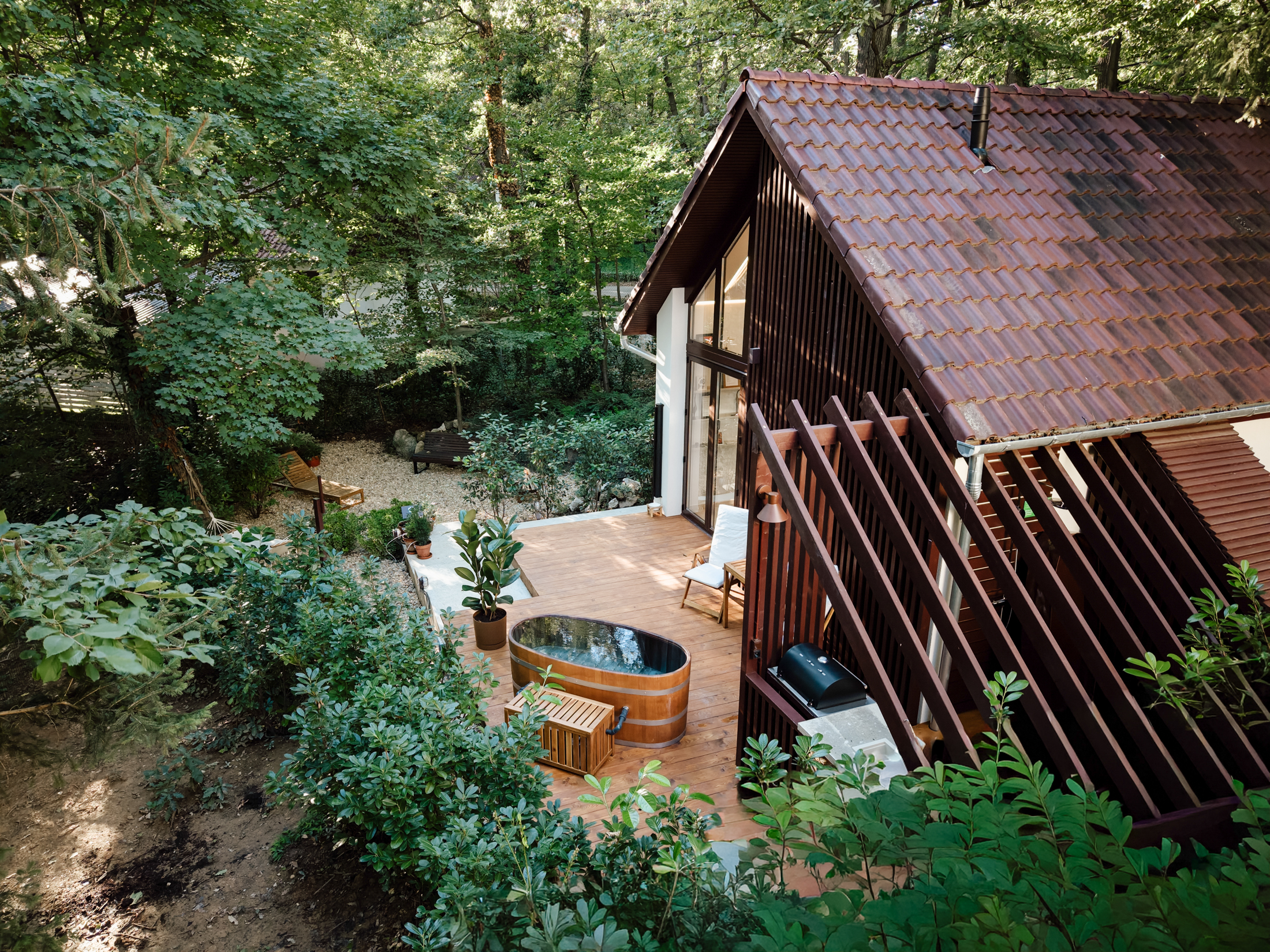 A belső tér mid-century stílusú, letisztult formákkal, természetes anyagokkal és meleg tónusokkal. A saját finn szaunában sótéglák fokozzák az élményt, míg a teraszon egész évben használható akácdézsa vár. A kertben kialakított zen kert és tűzrakóhely különleges esti hangulatot teremt, ahol a csend és a természet veszi át a főszerepet.