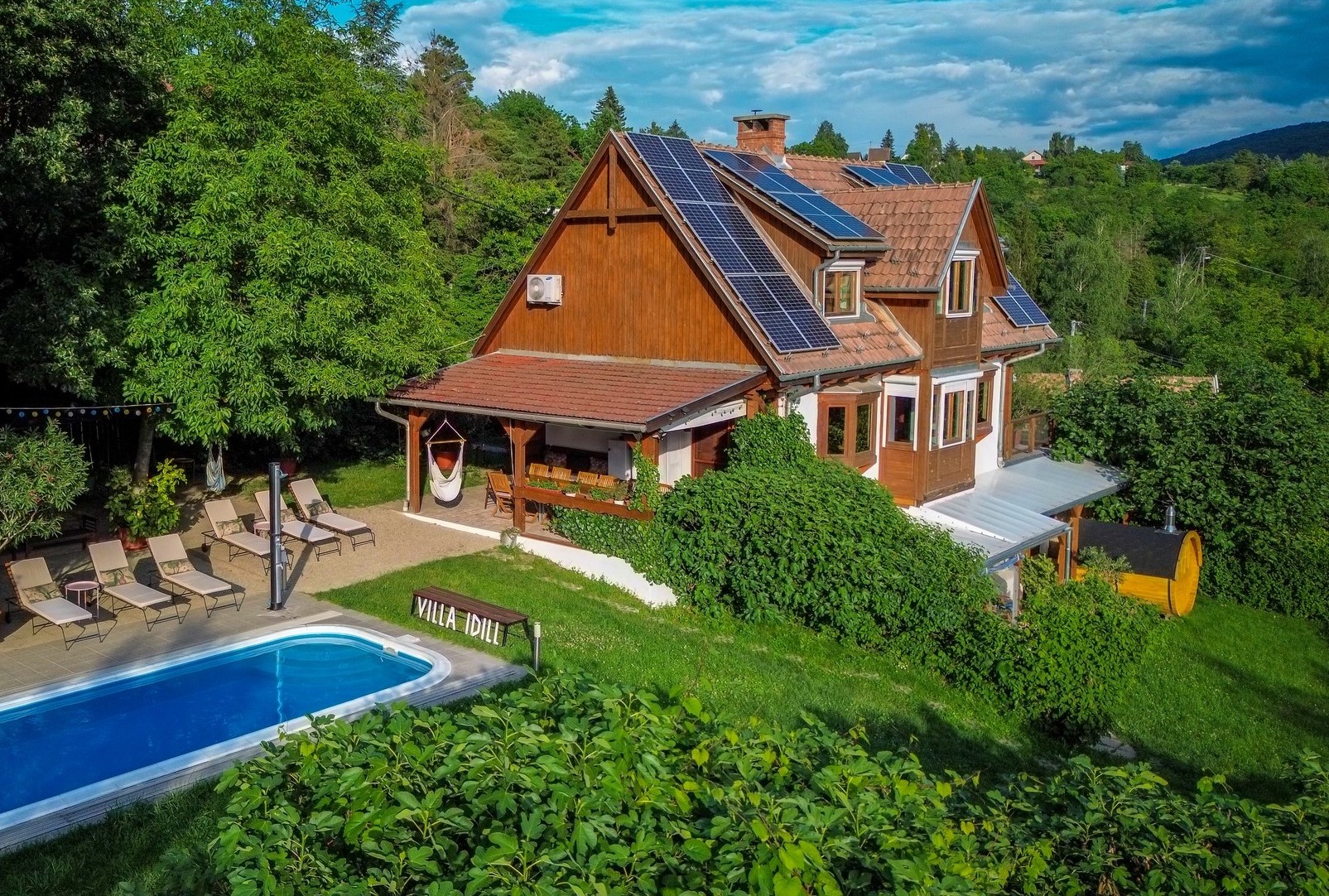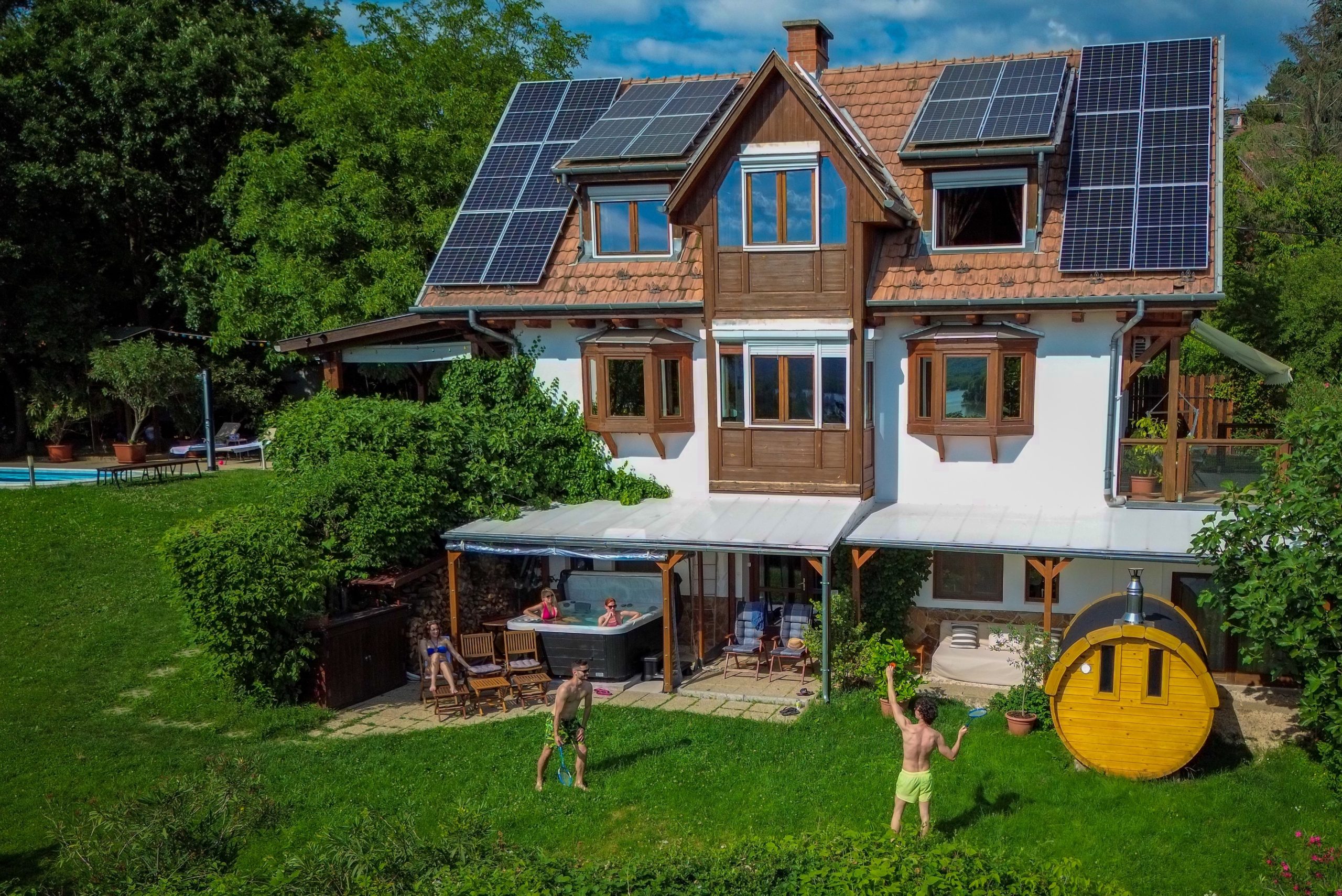 Nálunk minden együtt van egy tökéletes kikapcsolódáshoz: Ha hűvös van, a jakuzziban, a szaunában és a kandallós nappaliban melegedhettek. Nyáron a medencében, hűs teraszokon, a hatalmas kert árnyas fái alatt függőágyakban, függőszékekben, nyugágyakban pihenhettek. Természetesen a tetőtérben sem lesz melegetek, azt klíma és redőnyök tartják hűvösen.